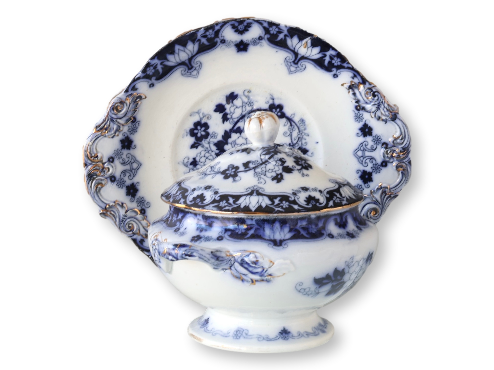English Flow Blue Sauce Tureen w/Tray