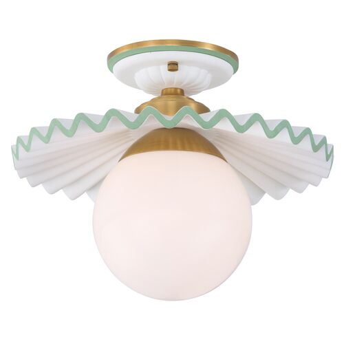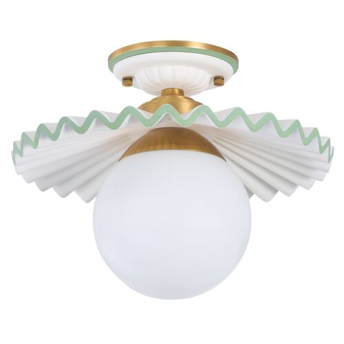 Fancy Ruffle Ceramic Flush Mount, White/Green/Antique Gold